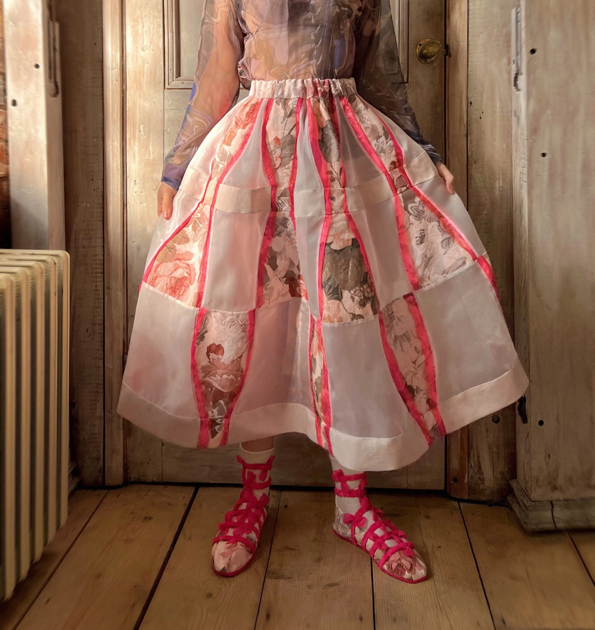 A floral explosion - this version features raw torn strips of neon pink silk scraps inserted into the vertical seams between the ‘bow’ patches. More about how we made this project can be found here: